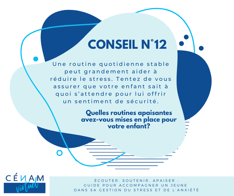 Une routine quotidienne stable peut grandement aider à réduire le stress. Tentez de vous assurer que votre enfant sait à quoi s’attendre pour lui offrir un sentiment de sécurité.